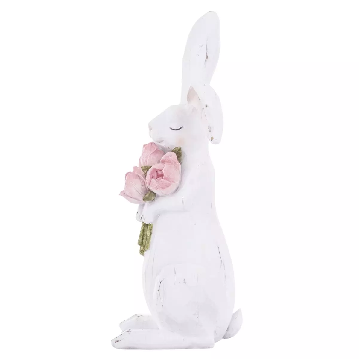 Zajączek w spokojnej, siedzącej pozie trzyma w łapkach bukiet wiosennych tulipanów – symbol odradzającej się natury i radosnej atmosfery Świąt Wielkanocnych. Starannie dopracowane detale, takie jak zamknięte oczka, delikatne zdobienia oraz pastelowe akcenty, sprawiają, że dekoracja przyciąga wzrok i dodaje wnętrzu przytulności.