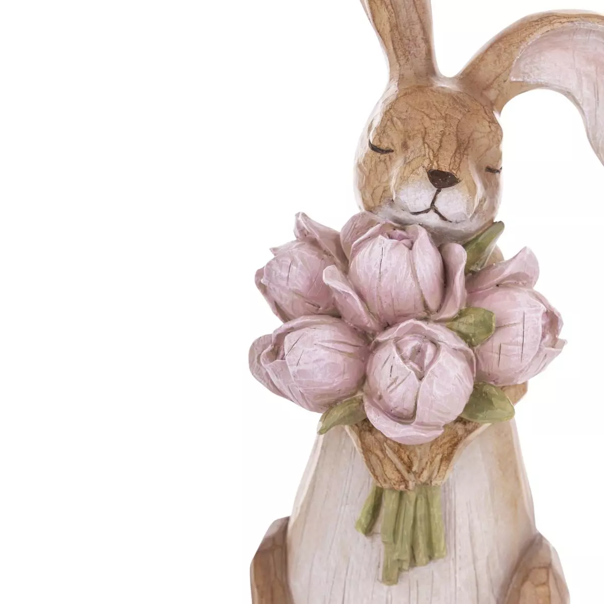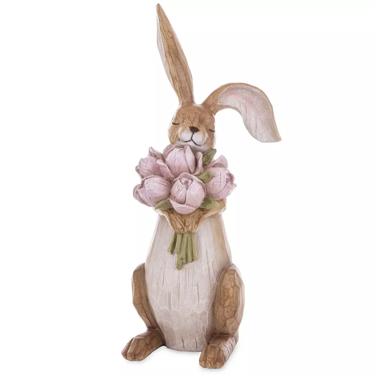 Figurka przedstawia siedzącego zajączka trzymającego bukiet kwiatów, co symbolicznie nawiązuje do budzącej się do życia natury oraz radosnej atmosfery Świąt Wielkanocnych. Styl inspirowany naturalnym drewnem dodaje jej rustykalnego uroku i sprawia, że pięknie komponuje się zarówno z nowoczesnymi, jak i klasycznymi aranżacjami wnętrz. Doskonale prezentuje się na komodzie, parapecie, stole wielkanocnym czy wśród wiosennych dekoracji.