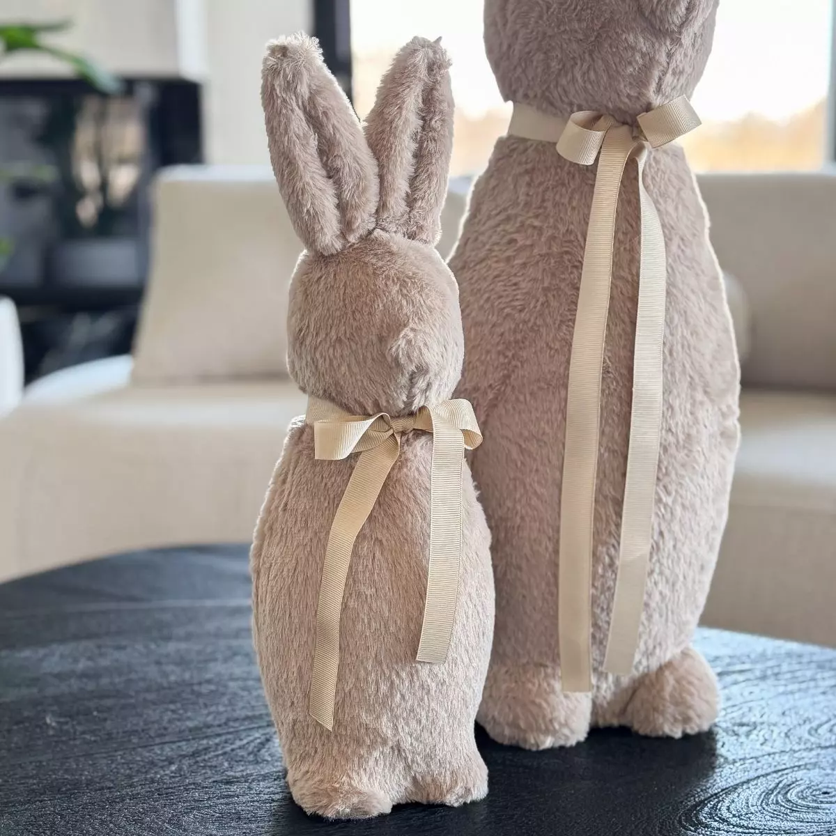 Zajączek został wykonany z miękkiego, delikatnego futerka, które nadaje mu uroczy wygląd i sprawia, że przyciąga wzrok już od pierwszej chwili. Smukła sylwetka oraz ozdobna kokardka dodają mu elegancji i sprawiają, że świetnie wpisuje się zarówno w nowoczesne, jak i klasyczne aranżacje wnętrz.